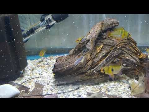 When I was trying to breed my wild rams they just were too shy... They did not like the bare tank. So I added some pothos cuttings and a few river stones and oak leaves. That helped a bit.. Problem was the leaves of the pothos were getting algae so I added a few small bristlenose.. problem solved.. Still the wild Rams just hid...obviously we were not going to get spawning like this. I decided to add some cherry shrimp to entice the Rams.. The shrimp disappeared as expected but the rams still mostly hid. I decided to add a few of my endler Guppies to the tank. I expected a blood bath but it didn't happen. The Rams ignored the Guppies and miraculously came out and settled down and bred. Ironically the guppies have even bred but as expected most of the guppy fry disappeared..not all though. Thrilled I decided to to add some glass shrimp as a clean up crew. These worked out great. There is only an air driven sponge in the tank.